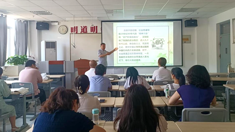 袁祖社教授以《明體達用體用貫通——習近平文化思想的理論精髓、精神實質與實踐品格》為題,緊密圍繞從中西比較觀照的視野看“何謂文化”以及“文化何為”、全球化新階段我國文化建設面臨的關鍵性挑戰與重要使命、習近平文化思想的理論品格、民族精神獨立性與文化主體性自覺、習近平文化思想的理論創新、精神實質及方法論啟示等方面展開精彩的講解。以《當代中國主要社會思潮:緣起背景、表征樣態、滲透邏輯與應對方略》為題,從社會思潮的核心內涵及其基本特征、當代中國社會思潮的形成及其演變階段、客觀認識和理智應對社會思潮的有效方略等三個方面展開講解。