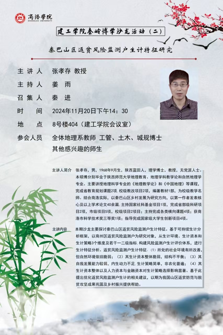 11月20日,城鄉(xiāng)規(guī)劃與建筑工程學(xué)院在8號(hào)樓404會(huì)議室舉辦2024年第二期“秦嶺博學(xué)沙龍”學(xué)術(shù)活動(dòng)。學(xué)院地理科學(xué)系全體教師及其他專業(yè)教師代表參加活動(dòng)。活動(dòng)由地理系系主任秦進(jìn)召集,城鄉(xiāng)規(guī)劃系系主任姜雨主持。