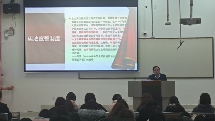 為了深入學(xué)習(xí)貫徹黨的二十屆三中全會(huì)精神,紀(jì)念第十一個(gè)國(guó)家憲法日,馬克思主義學(xué)院邀請(qǐng)商洛市律師協(xié)會(huì)副會(huì)長(zhǎng),商洛市“八五”普法講師團(tuán)講師,陜西天乾律師事務(wù)所創(chuàng)始合伙人、主任陳波為學(xué)生作了“弘揚(yáng)憲法精神,培養(yǎng)法治思維”的專題報(bào)告。