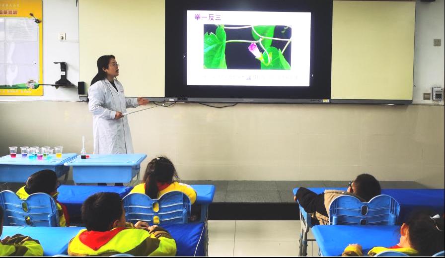 在小朋友們理解了富含花青素的紫甘藍遇酸堿會發生顏色變化后,王丹博士進一步通過視頻展示了牽牛花一天中的變化,引導孩子探究它從紫色變為粉紅色的原因。這一過程不僅培養了孩子們對大自然的熱愛,還激發了他們的觀察力和探究精神,提升了科學素養。