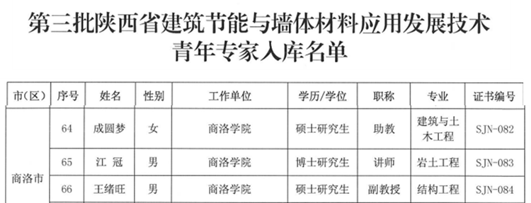 近日,陜西省建筑節能與墻體材料發展中心公布了第三批陜西省建筑節能與墻體材料應用發展技術“青年專家”選聘結果,建工學院王緒旺、江冠、成圓夢3位教師受聘為陜西省建筑節能與墻體材料應用發展技術“青年專家”。