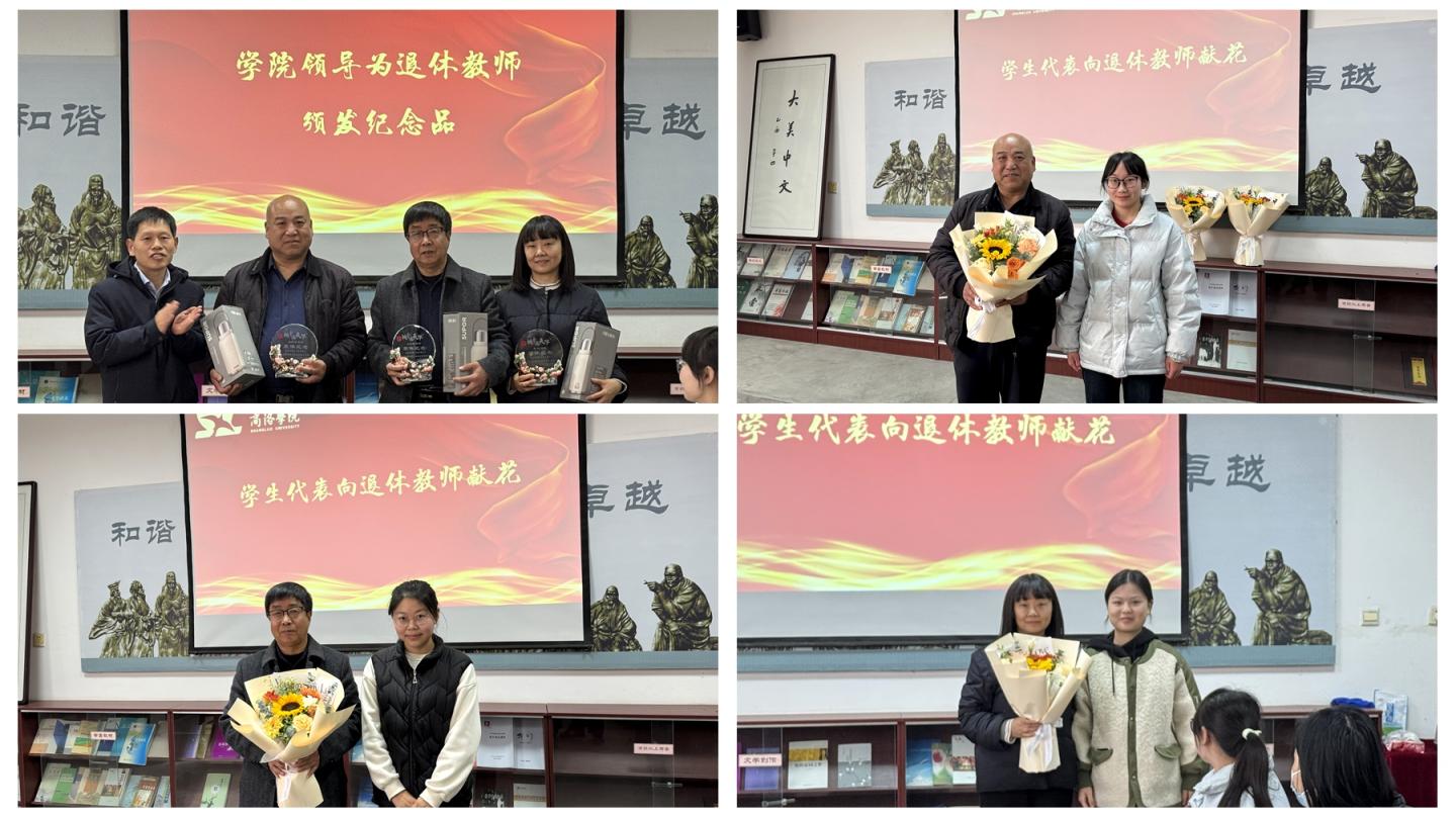 活動中,張文諾代表學院為退休教師頒發紀念品。學生代表手捧鮮花走上臺前,向三位退休教師獻上誠摯的敬意,并在發言中深情感念老師們的諄諄教誨與人格魅力,并承諾將傳承師者精神,努力成長為社會的棟梁之材。