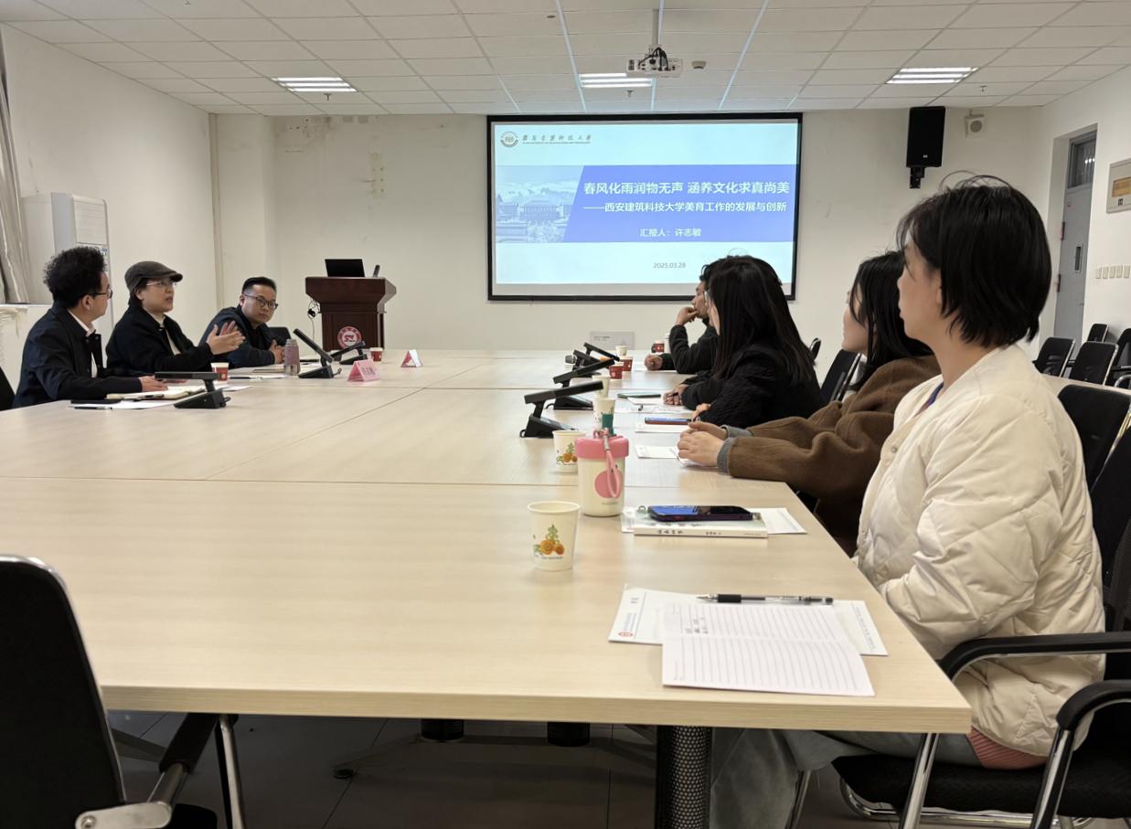 在美育講座中,陜西省高校美育教指委副主任兼秘書長、西安建筑科技大學文化藝術教育中心主任許志敏受邀為我校美育工作辦公室、公共藝術教育中心相關成員及藝術學院相關負責人作題為《春風化雨潤物無聲、涵養文化求真尚美——西安建筑科技大學美育工作的發展與創新》的報告,她結合高校美育工作經驗,就高校如何遵循美育特點面向全體學生開展美育工作分享了多元化創新實施路徑。許志敏提出要發掘非藝術專業學生的審美需求和藝術潛能,加強學生藝術社團在美育活動中的引領作用。在互動交流環節,與會教師就我校美育工作核心任務、美育師資隊伍建設、美育課程建設等問題與許志敏深入交流,現場氣氛熱烈。