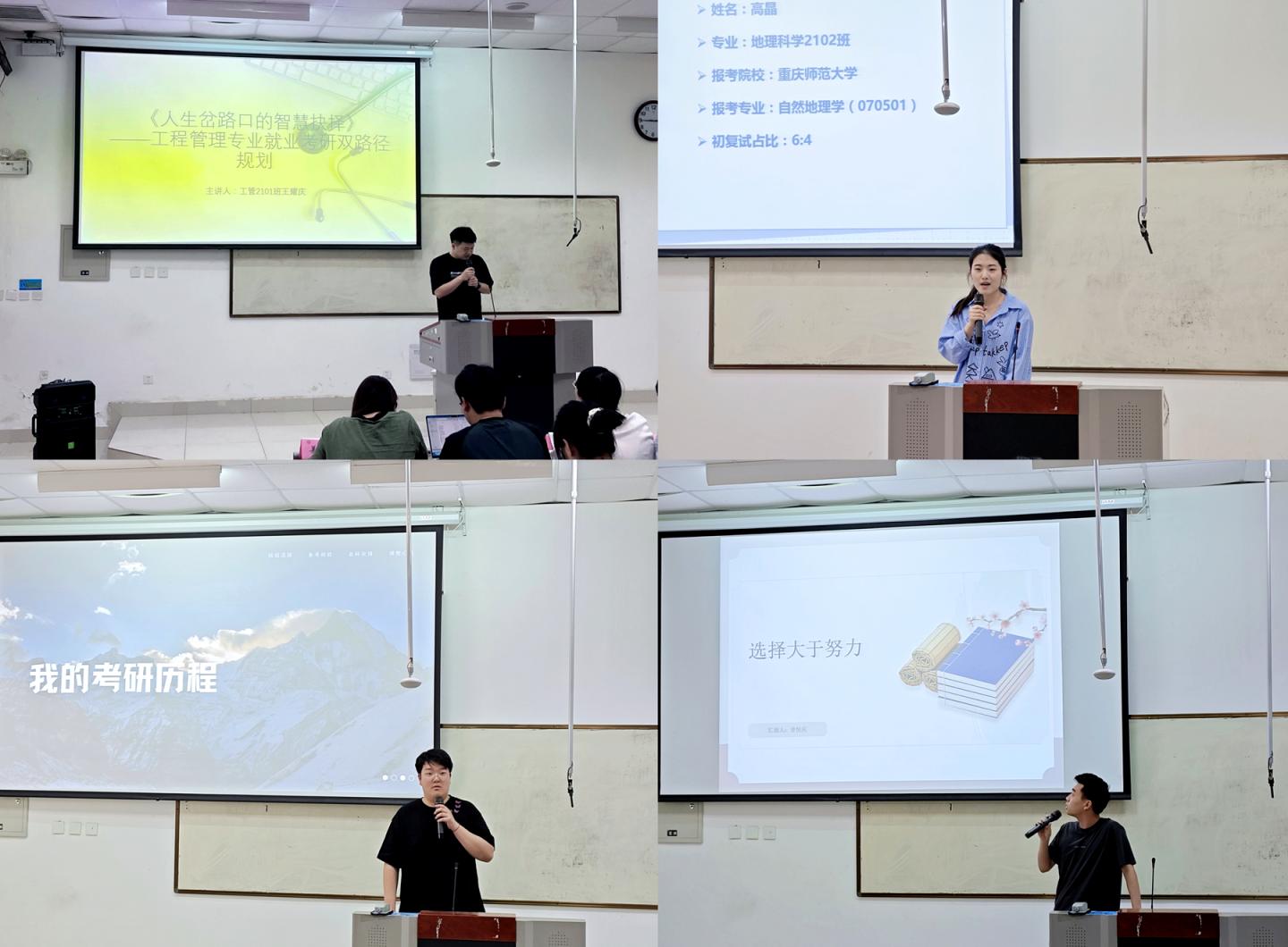 來自2025屆考研成功的四位學生代表,聚焦科學規劃、心態調節與資源利用等方面,分享了分層學習計劃、真題演練、定期復盤等復習策略。他們鼓勵師弟師妹們保持良好的考研心態,合理疏導備考壓力。在互動答疑環節,同學們就院校選擇、跨專業考研、時間管理等核心問題踴躍提問。與會老師和考研成功代表結合實戰經驗,針對性解答備考重點、復習節奏把控等關鍵內容,給出詳實且實用的建議。