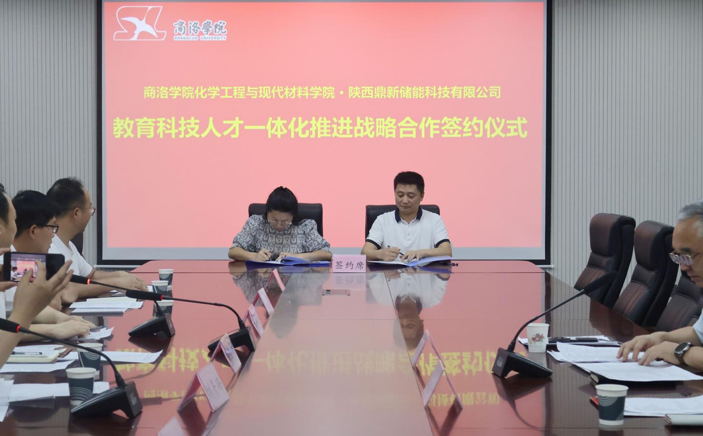 為深化產教融合、推進人才訂單式培養,6月24日,化材學院與陜西鼎新儲能科技有限公司簽署《教育科技人才一體化推進戰略合作框架協議》。簽約儀式上同時舉行了由鼎新公司贊助的“鼎新杯”商洛學院第三屆節能減排社會實踐與科技競賽頒獎儀式。