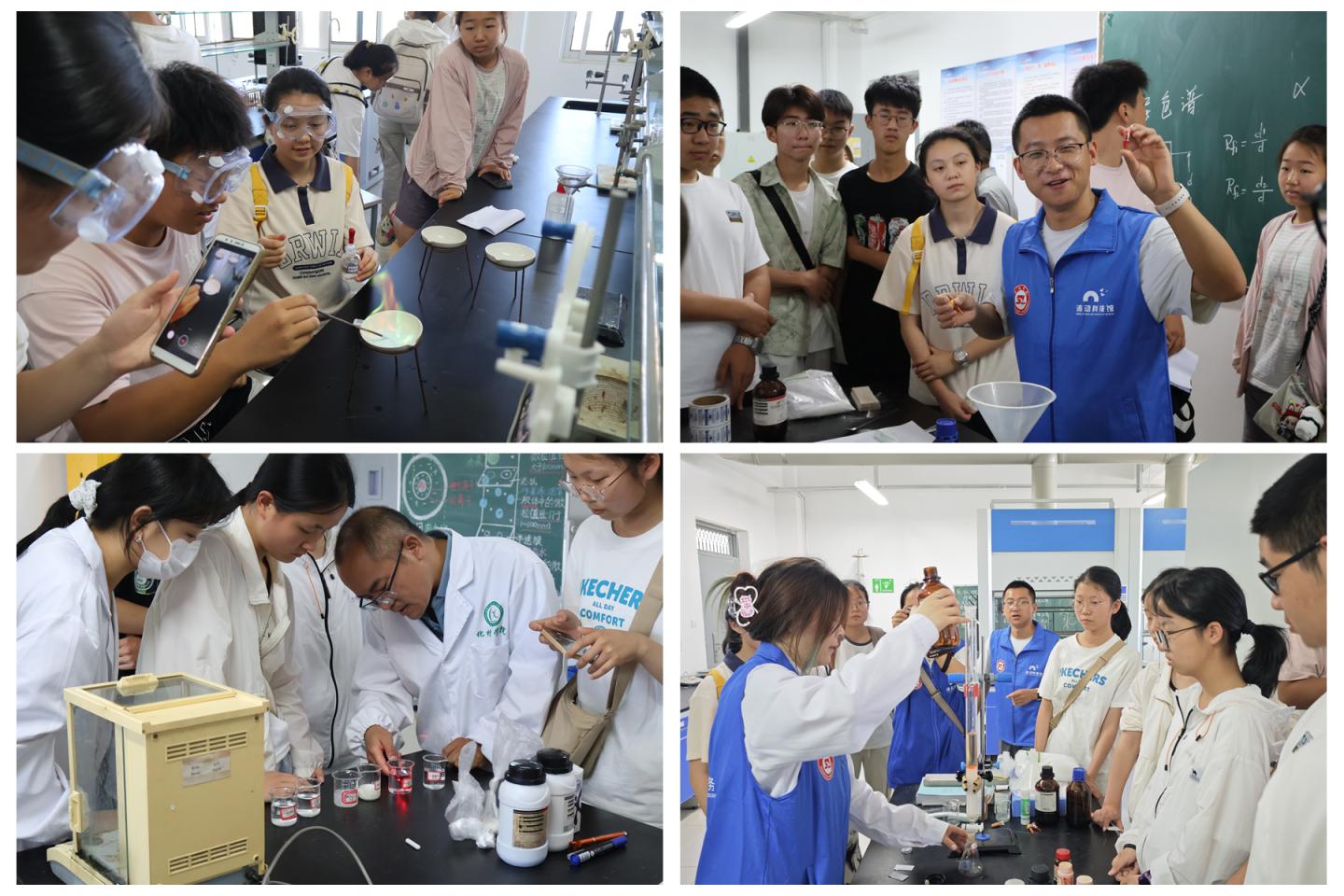 在無機化學實驗室,高霞博士以“點亮化學之光 —— 焰色反應實驗探秘” 為主題,從原子結(jié)構(gòu)與電子躍遷理論出發(fā),解析鈉、鉀等金屬鹽溶液灼燒顯色的科學原理,結(jié)合礦物分析等生活實例,帶領(lǐng)學生領(lǐng)略化學視覺奇觀,實驗師劉萍指導學生完成實驗,辨識不同金屬焰色。有機化學實驗室中,王以壽博士以 “薄層色譜、柱色譜分離技術(shù) —— 色素的高效分離” 為核心,結(jié)合蘇丹紅檢測等科研實例,講解色譜技術(shù)在食品安全等領(lǐng)域的應用,學生在志愿者協(xié)助下體驗染料分離實驗。物理化學實驗室內(nèi),劉永亮博士以牛奶等生活膠體現(xiàn)象為切入點,指導學生制備膠體,觀察丁達爾效應等現(xiàn)象,理解膠體應用價值。化學教學論實驗室里,史景濤博士以橙子等為樣本,帶領(lǐng)學生開展實驗,通過果汁對高錳酸鉀溶液的還原反應,探究維生素 C 還原性及酸度影響,搭建學科認知橋梁。