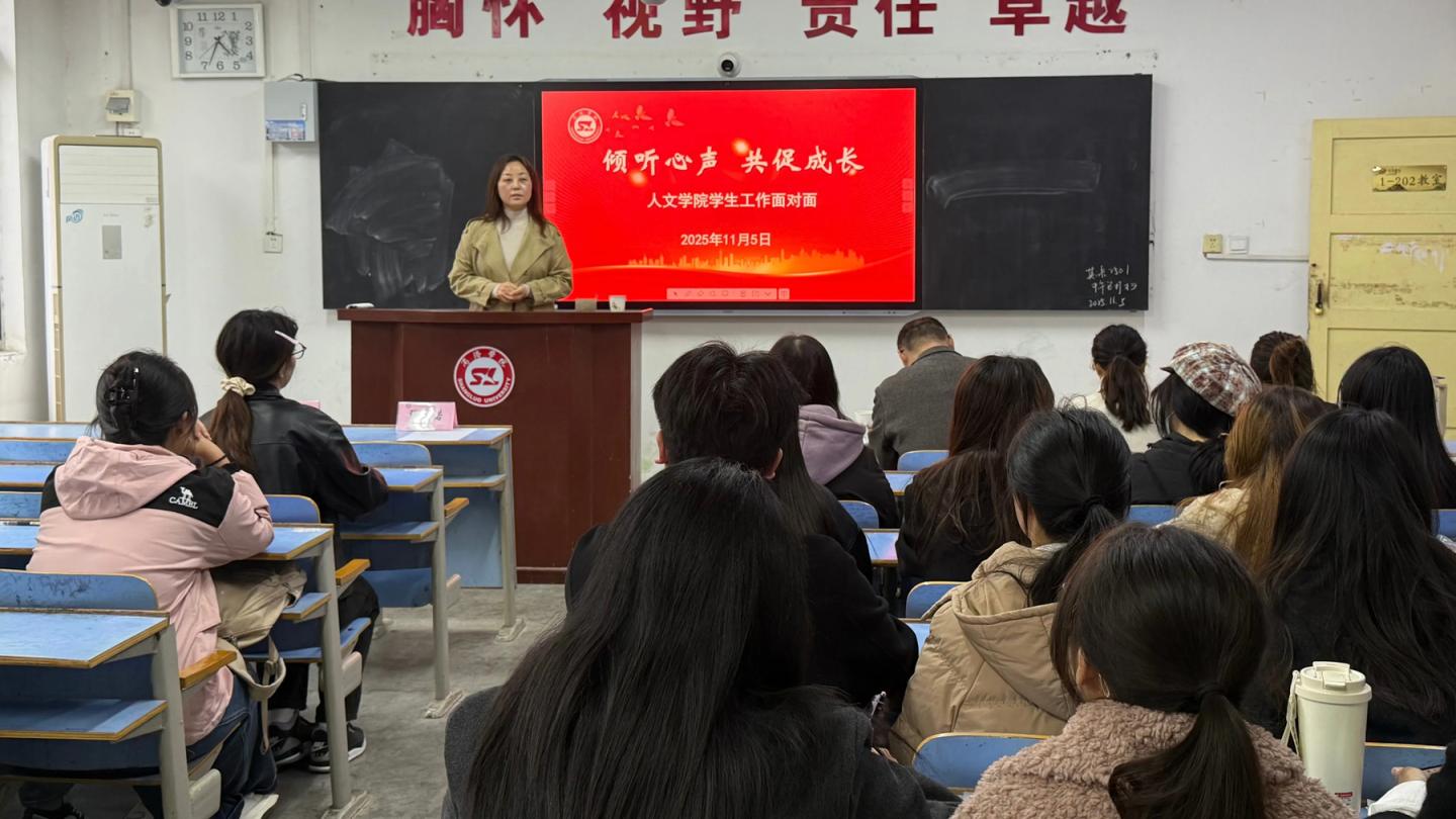 為深入了解學生學習與生活需求,構建暢通高效的溝通橋梁,11月6日,人文學院舉辦“聆聽心聲,共促成長——學生工作面對面”座談會。人文學院黨委書記劉麥霞、黨委副書記王剛、副院長張建軍、教學秘書、學工辦主任及人文學院各年級學生代表共同參與了本次活動。